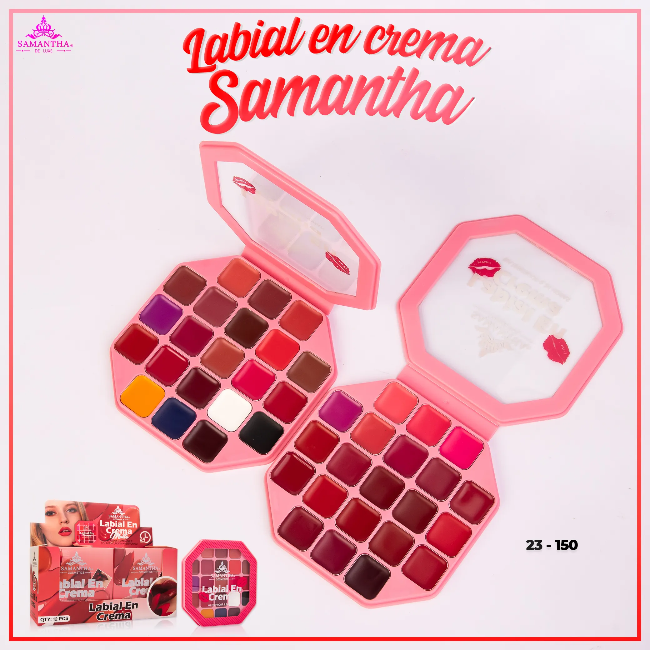 Labial en crema Samantha: fórmula de larga duración, colores vibrantes, textura suave, hidratación y brillo, presentación en caja con 12 unidades.